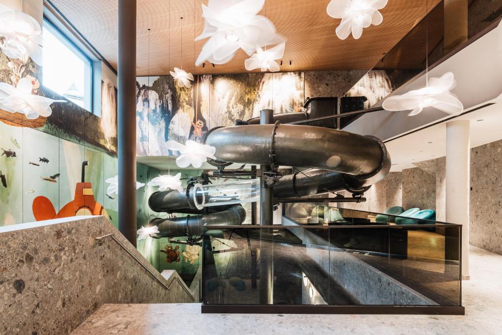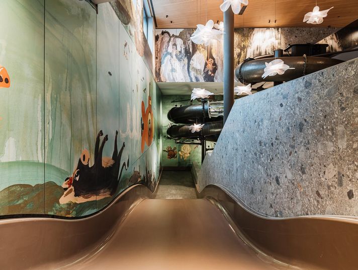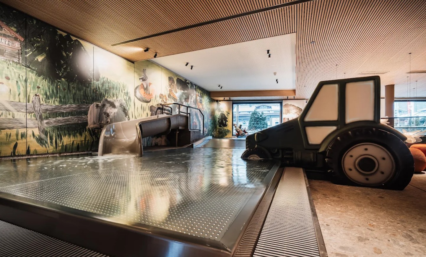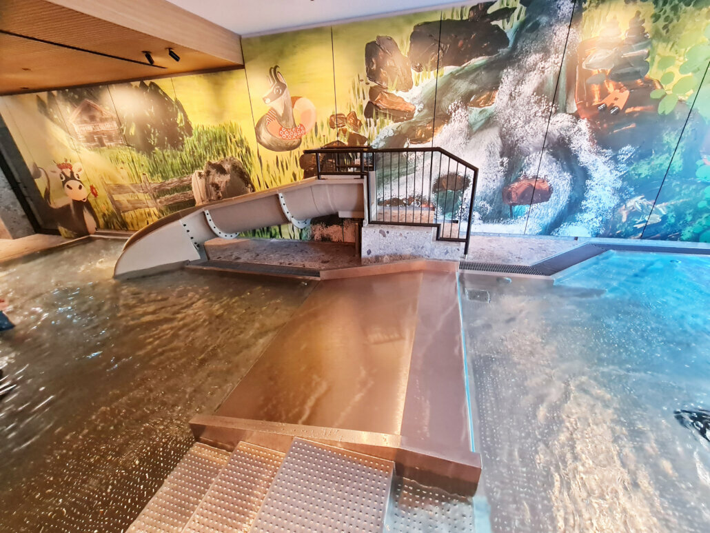 • Kinderwasserwelt: Babybecken mit Attraktionen, Traktorrutsche und Kinderrutsche; Röhrenrutsche 90 m, Breitwellenrutsche 25 m;