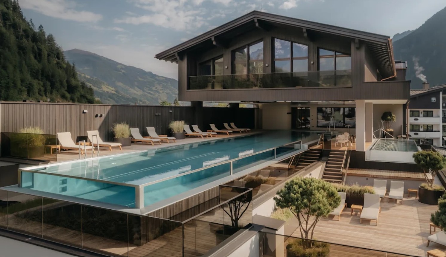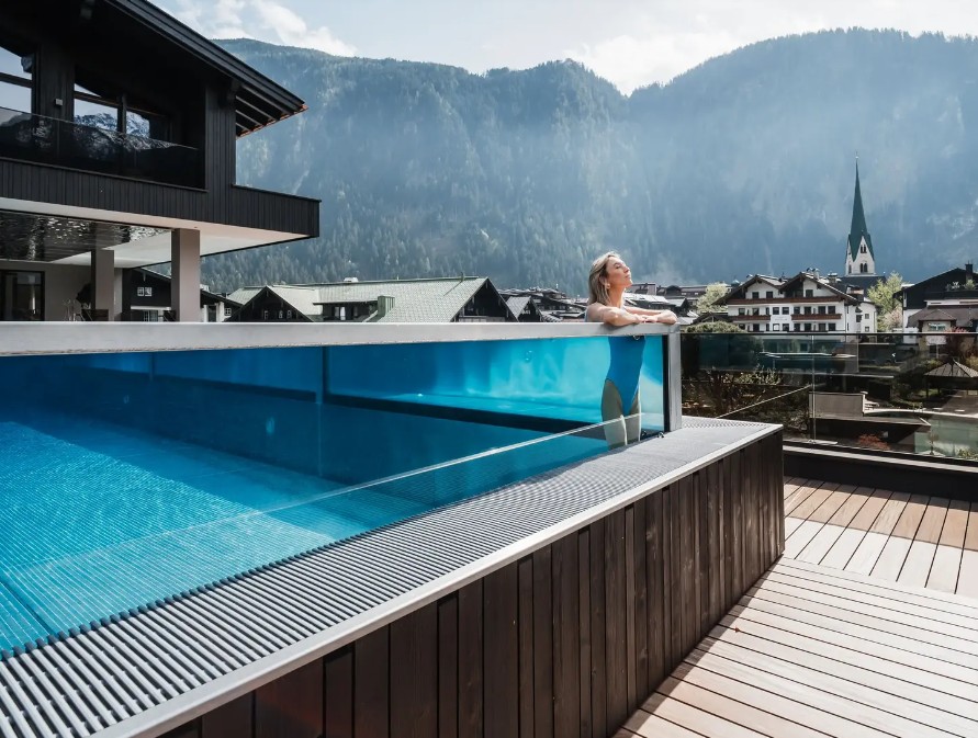 • Freibecken aus Edelstahl, 125 m² Wasserfläche,
